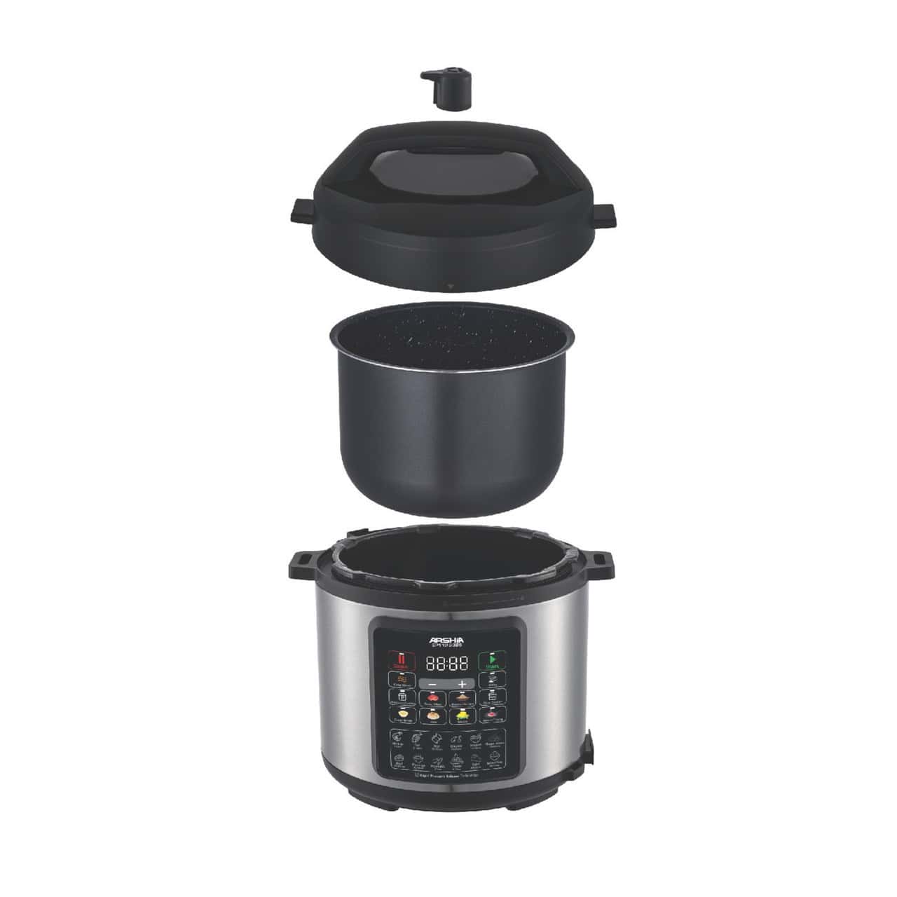 طنجرة ضغط آرشيا الرقمي يوفر لك طهيًا سريعًا ودقيقًا وآمنًا بلمسة واحدة. بفضل سعته 6 لتر، يمكنه تحضير تشكيلة واسعة من الأطعمة مثل الأرز، اللحوم، الشوربة، الكيك والمزيد. يأتي مع وعاء داخلي غير لاصق بالإضافة إلى وعاء ستانلس ستيل إضافي، ليسهّل التنظيف ويمنحك مرونة في الاستخدام. يتميز ببرمجة مسبقة ذكية، مؤقت 24 ساعة، وحافظ حرارة تلقائي يصل إلى 12 ساعة.